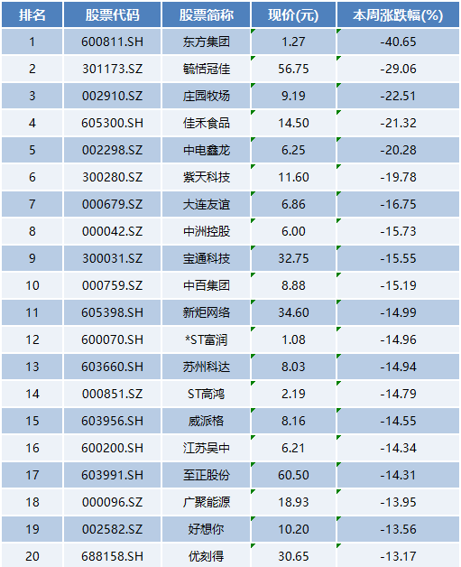 本周个股跌幅榜前五位分别是东方集团、毓恬冠佳、庄园牧场、佳禾食品、中电鑫龙,本周累计跌幅分别为40.65%、29.06%、22.51%、21.32%、20.28%。