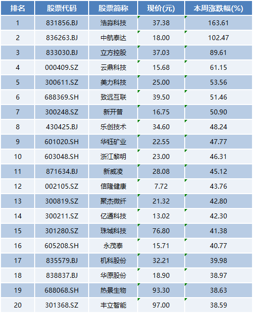 个股方面,本周个股涨幅榜前五位分别是浩淼科技、中航泰达、立方控股、云鼎科技、美力科技,累计涨幅分别为163.61%、102.47%、89.61%、61.15%、53.56%。