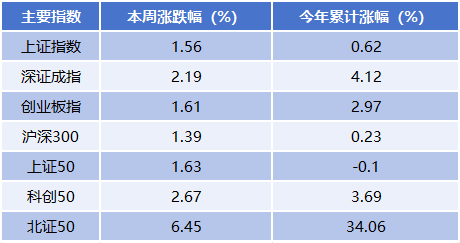 指数层面,本周A股主要指数均收涨。其中,以科技为代表的科创50、北证50指数涨幅居前,北证50指数本周累计上涨6.45%,今年以来累计上涨34.06%;科创50指数本周累计上涨2.67%,今年以来累计上涨3.69%。