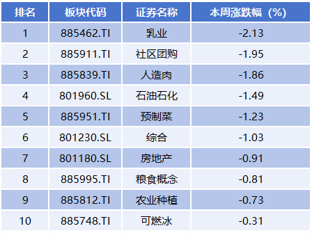 本周排在跌幅榜前排的概念板块分别为乳业、社区团购、人造肉、石油石化、预制菜,累计跌幅分别为2.13%、1.95%、1.86%、1.49%、1.23%。