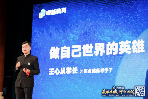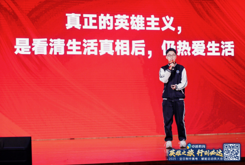 在卓越高考复读一年后,现就读于中山大学管理学院的往届生王同学,作为学长代表分享了他最深的感悟:祛魅。他鼓励学子们不迷信权威,在祛魅后的真实世界中,以清醒的自我认知和坚定的内在信仰,站在舞台中央,成为自己人生的英雄。他鼓励学弟学妹们在最后的一百天,不再为他人而战斗,也无需与他人相比较,而是选择做自己世界的英雄。
