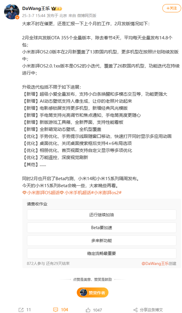快科技3月7日消息,今日,小米公司应用软件部总监王乐在微博发布了2月小米澎湃OS发版情况。