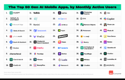 a16z 每半年就会对全球排名前 50 的 AI 原生网页产品(按 Similarweb 的每月独立访问量统计)和排名前 50 的 AI 原生移动应用(按 Sensor Tower 的月活跃用户数统计)进行排名。