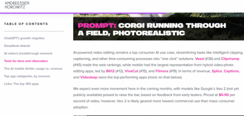 a16z 在发文中提到,人工智能驱动的视频编辑软件仍然是消费类人工智能的一个主要场景,这类应用将智能剪辑、字幕和其他耗时的过程简化为“一键式”的解决方案。移动端在混合视频照片编辑应用程序中最为代表性的产品之一,便是 VivaCut。