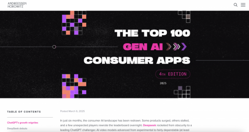 3 月 7 日凌晨,硅谷顶级风投 a16z 正式发布最新一期全球 Top 100 AI 应用榜单。