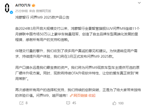 这套方案放出后吸引了非常多老车主的关注,毕竟谁不想让自己的车越发强大?好消息是,官方随即声明称,将为问界M9现款车型车主提供可选的原厂硬件升级方案,同时,现款将持续OTA升级软件特性,做到“常用常新”。
