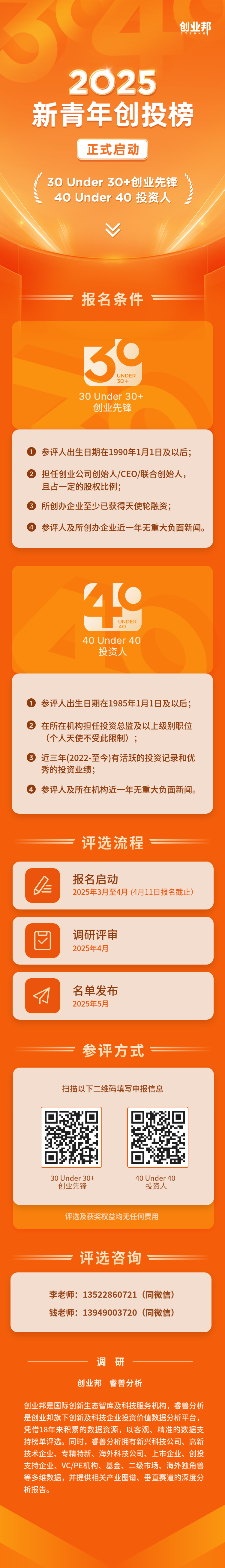 创业邦持续关注创投圈青年新势力,今年正式启动2025年度“35岁以下创业先锋”和“40岁以下投资人”评选活动。欢迎有为青年报名参选,以下为评选报名指南: