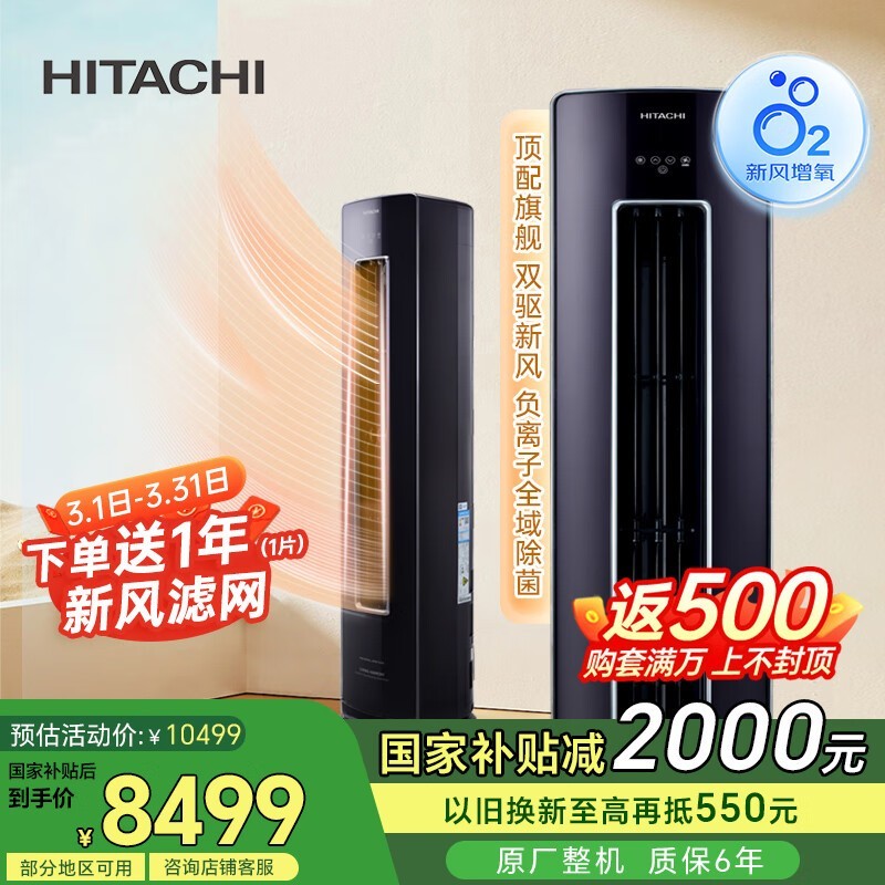 日立1级能效3匹变频柜机空调,新风负离子除菌,智能Wi-Fi控制