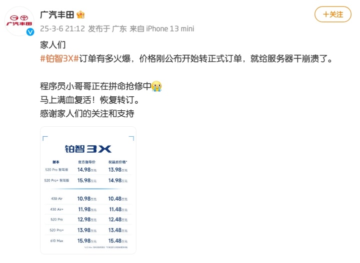 拉低了身段的丰田也马上尝到了甜头,据广汽丰田官微发布消息,铂智3X订单火爆,价格刚公布开始转正式订单,就给服务器干崩溃了。随后公布的数据显示1小时订单破万,取得了开门红。