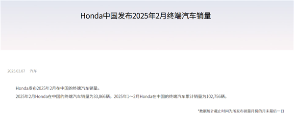快科技3月7日消息,本田发布2025年2月在中国的终端汽车销量,为33866辆;2025年1-2月本田在中国的终端汽车累计销量为102756辆。