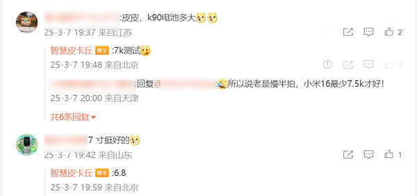 针对网友关于K90电池容量的询问,该博主回应称,目前正在测试7000mAh的电池。值得注意的是,今年中端手机的电池容量普遍较高,7000mAh已成为不少机型的标配,相比之下,去年的6000mAh已算是大容量。此外,还有消息称今年将推出搭载7500mAh电池的新机型。