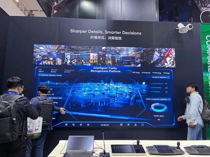 走进监控中心场景,LED 大屏上正轮番播放本次展会主题视频和数据看板。借助现场 4 个 IPC 画面投屏,观众仿佛能真切代入现代化监控中心管理者的视角。