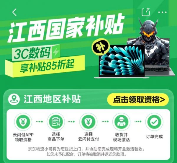 具体领取与使用流程为:定位在江西的消费者打开云闪付APP,点击“以旧换新”找到“线上数码3C专区”,点击领券,领取对应品类“补贴资格”。领取后,打开京东APP搜索“江西3C国家补贴”进入活动会场,可在会场内浏览选购,也可直接搜索符合要求的商品选购,收货地址在江西景德镇、上饶,选择云闪付完成支付即可享受补贴。