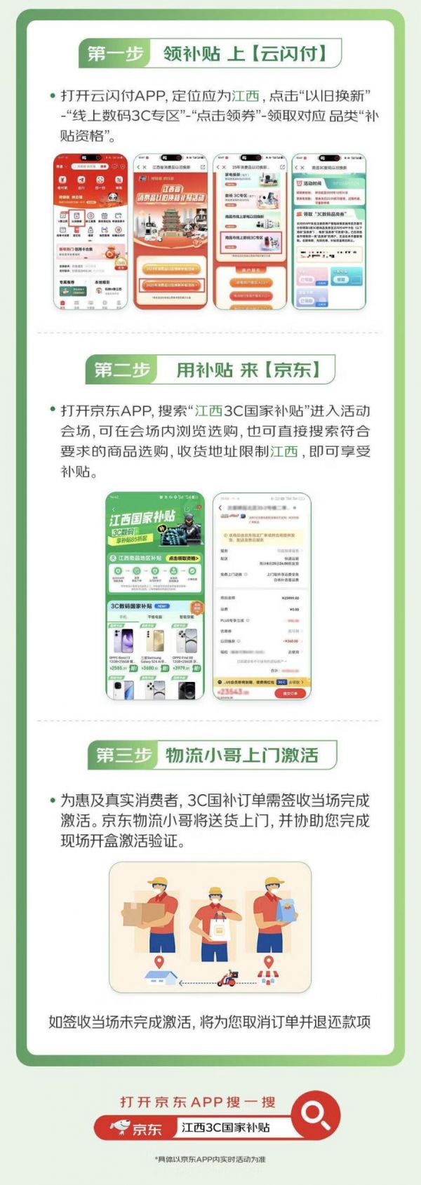 根据国家补贴政策要求,手机等数码产品购新补贴需要现场拆盒激活。京东快递小哥在送货上门时,会协助消费者快速完成现场激活验收,确保消费者能够便捷地享受到补贴带来的实惠。