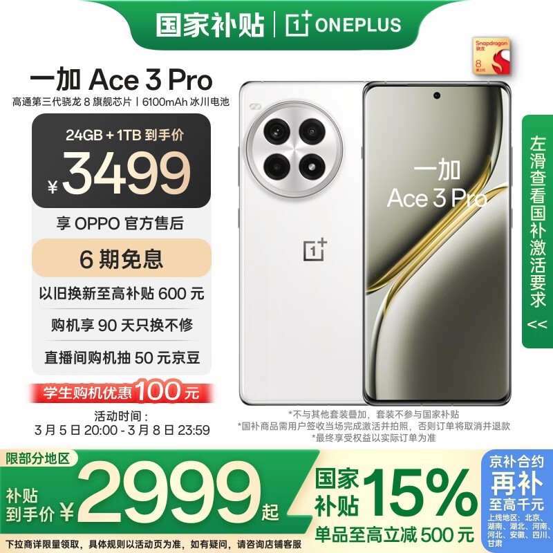 一加Ace 3 Pro 5G超跑瓷版京东优惠价2734元