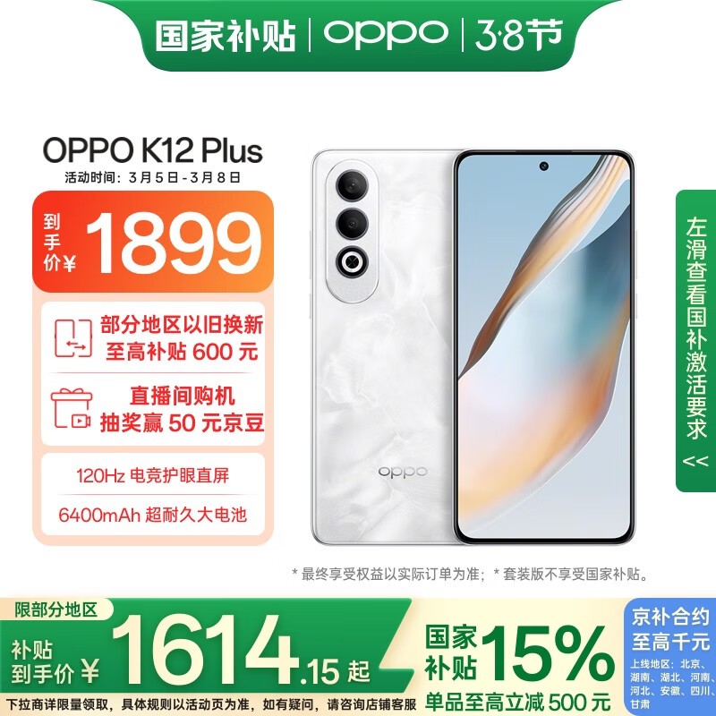 OPPO K12 Plus 5G手机雪峰白12GB+512GB京东特惠1470元