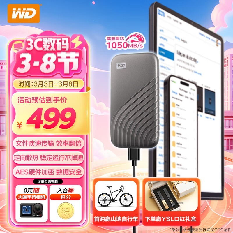 西部数据WD 500GB Type-C固态移动硬盘轻薄便携性能强劲