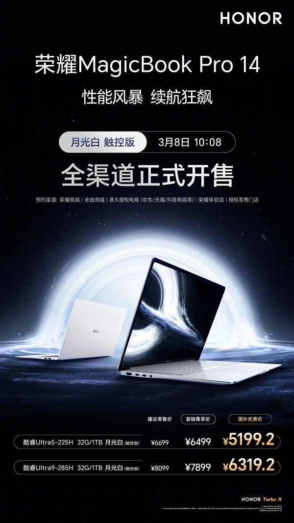 快科技3月8日消息,今天上午10:08,荣耀MagicBook Pro 14月光白触控版正式开售,官方定价6499元起,国补到手价仅需5199.2元起。