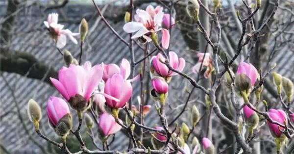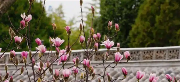 花蕊呈玫红色,花型酷似莲花,枝头娇俏的花朵与古建筑交相辉映,别有一番景致。