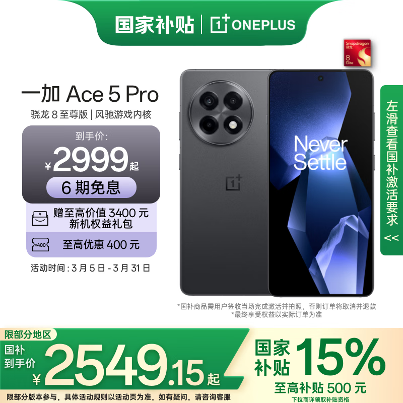 一加Ace 5 Pro 16GB+512GB潜航黑京东优惠价3139元