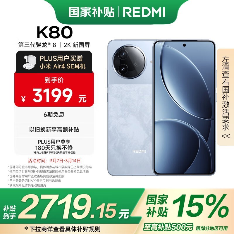 Redmi红米K80 5G手机16+512GB汐月蓝 首发特惠2416元