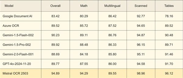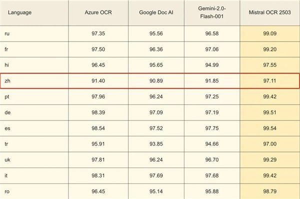 毕竟在他们的评分表里, Mistral OCR 支持的语言不仅多,而且个个的得分都接近 99% 。。。