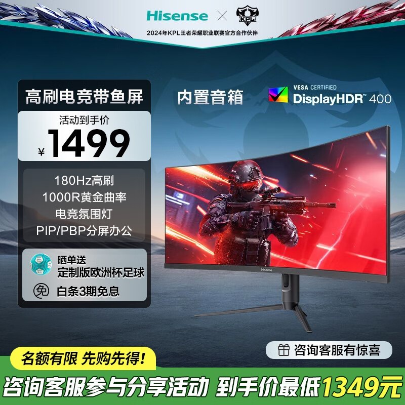 海信34英寸电竞带鱼屏显示器34G6K-PRO仅1274元