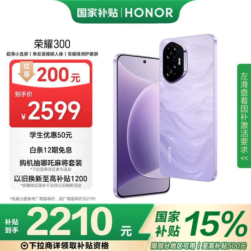 荣耀HONOR 300 5G庐烟紫手机优惠后1977元