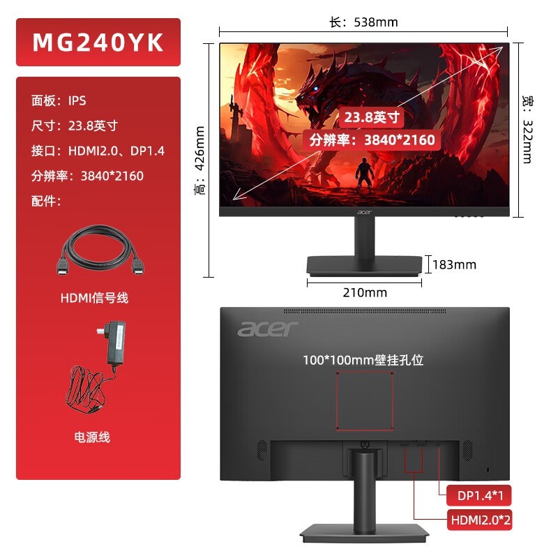 宏碁MG240YK 24英寸4K显示器京东优惠价