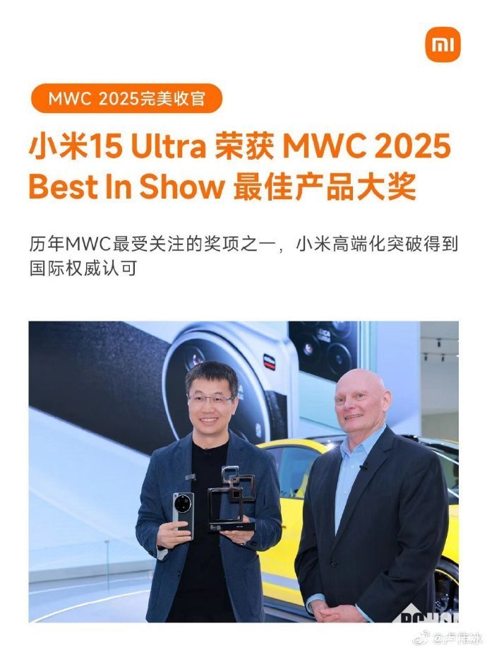 值得一提的是,小米 15 Ultra在MWC 2025上斩获了Best In Show最佳产品大奖。该奖项是历年MWC最受关注的奖项之一,小米 15 Ultra 获此殊荣,意味着小米在高端化道路上的突破得到了国际权威认可,进一步提升了小米品牌在全球的影响力。