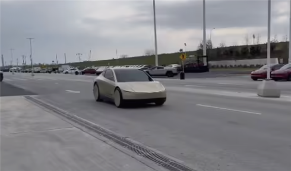 图中展示了一辆金色涂装的Cybercab,正在得克萨斯超级工厂附近进行自动驾驶巡游,马斯克表示期待这些车辆未来能遍布公共道路。