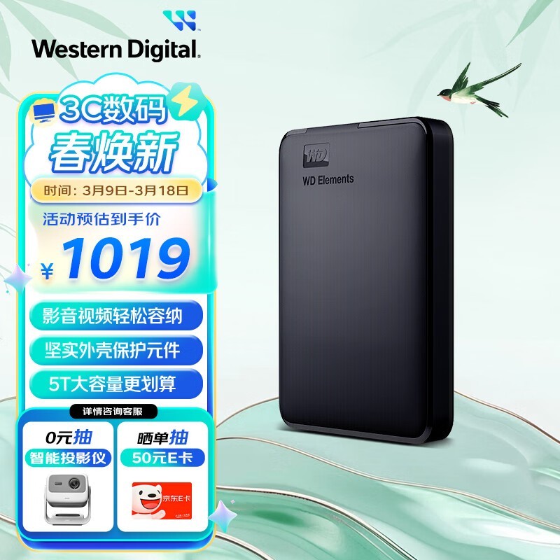 西部数据Elements 5TB移动硬盘京东999元促销