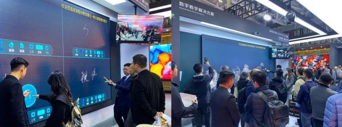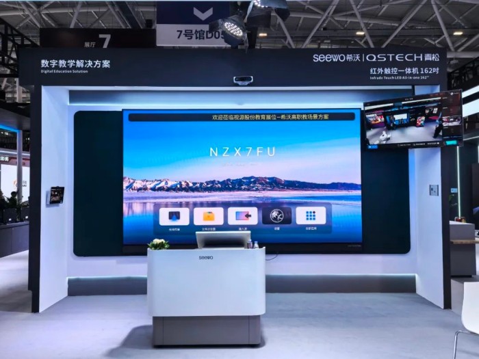 教育解决方案展区,青松光电以LED一体机为核心,搭配希沃讲台和希沃录播系统,构建了一套完整的服务于师生的数字化教学系统。通过双拼联控联触技术,讲台能便捷操作LED一体机,实现面对面互动教学。