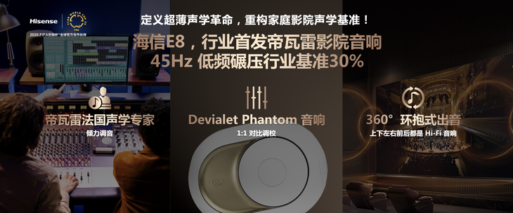 音质方面,E8Q 系列与法国国宝级音响品牌帝瓦雷深度合作,搭载行业首发Hi-Sound 音质芯片,实现 45Hz 超低频下潜与 0.01% 失真度。116 吋 E8Q Pro 更配备巴黎歌剧院定制声学系统,通过 SAM 低音增强技术与剧院级声学负载设计,让电视秒变私人影院。