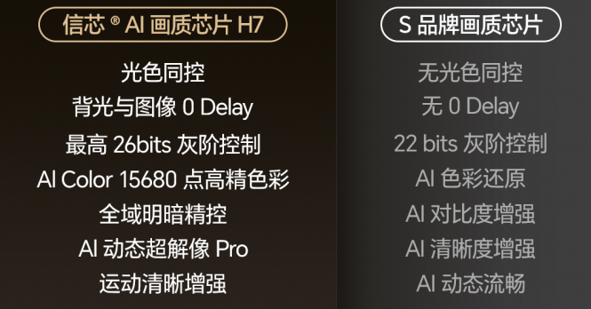 历时三年研发、投入超亿元的信芯H7芯片,首次实现“光色同控”技术突破。通过26bit灰阶解析与15680点色彩管理,逐点拟合光线与色彩信息,解决传统控光技术色彩断层问题。对比索尼XR芯片,H7在背光同步、控光精度及场景适配能力上实现全面领先,CPU单核性能提升40%,被喻为“电视界的5090显卡”。