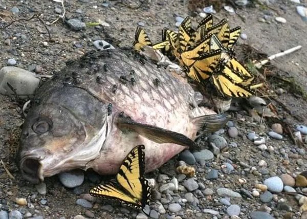 上面这个是一条死去鲤鱼被蝴蝶“啃食”的画面,从照片中可以看出,这可能是在某处的河滩上!