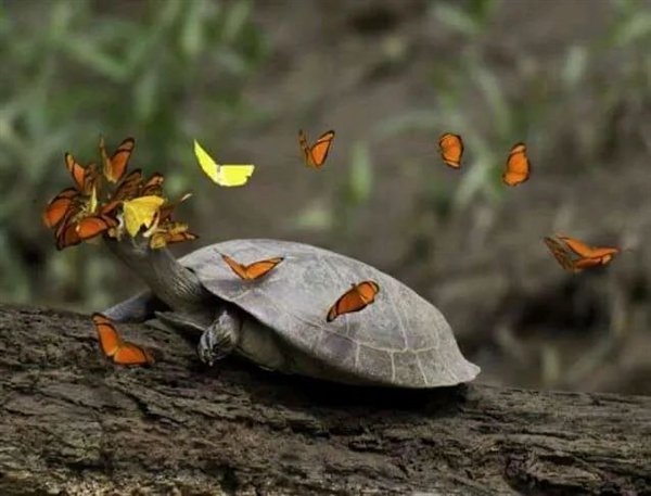 这张蝴蝶和乌龟的照片,更像是攻击行为,这只乌龟很快就会不堪其扰,扑通一声跳入水中,溜之大吉。