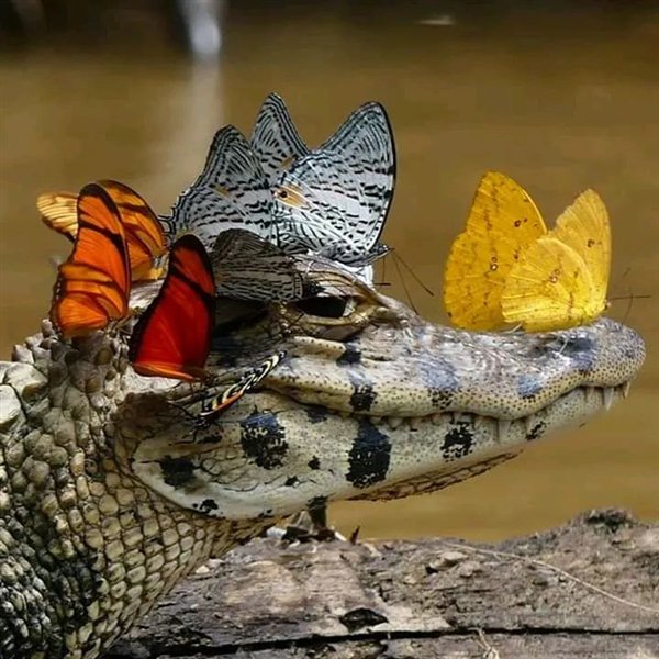 上面这个是不同种类蝴蝶集体“攻击”鳄鱼的情景,不过这张图片看起来挺和谐的,并不像蝴蝶在“攻击”鳄鱼,相反它更像是蝴蝶在为鳄鱼服务。