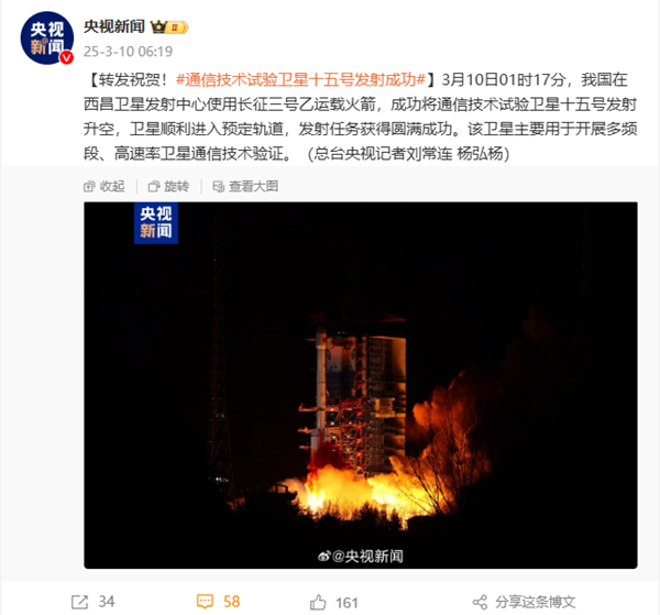 快科技3月10日消息,据央视新闻报道,今天01时17分,我国在西昌卫星发射中心使用长征三号乙运载火箭,成功将通信技术试验卫星十五号发射升空,卫星顺利进入预定轨道,发射任务获得圆满成功。