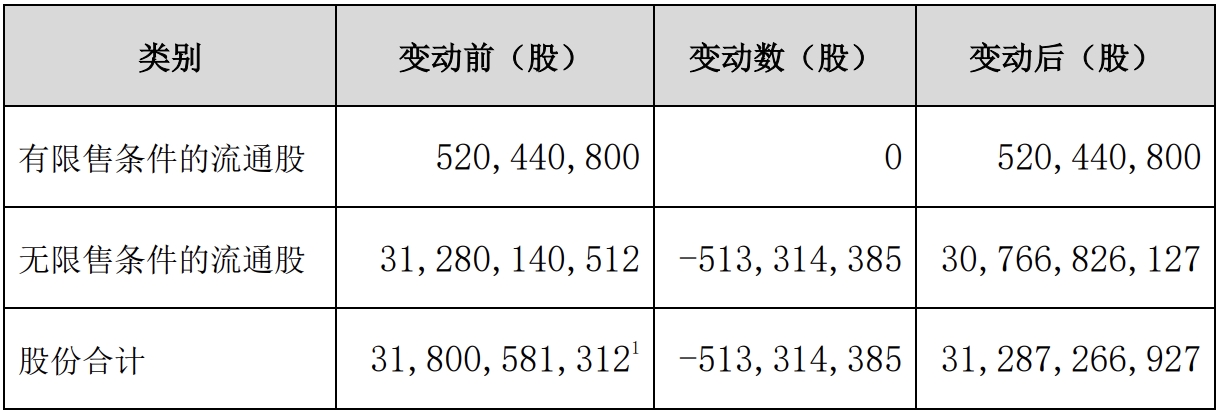 注销后,公司总股本由31,800,581,312股减少至31,287,266,927股。