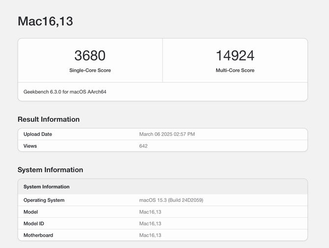 结果可见,在单核测试中,M4 MacBook Air得分3,680分;在多核测试中,M4得分高达14,924分。当然,在无风扇设计的MacBook Air上,持续工作负载下的性能几乎肯定无法与其配备主动散热的MacBook Pro机型相媲美。