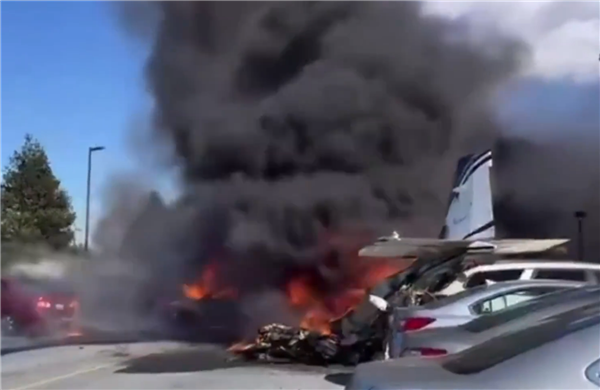 从事发现场的视频可以看到,这架坠落的飞机已经面目全非,现场燃起熊熊大火,并伴随着滚滚浓烟,火势凶猛,将整架飞机几乎完全吞噬,并引燃了停车场内停放的一些车辆,看起来异常骇人。
