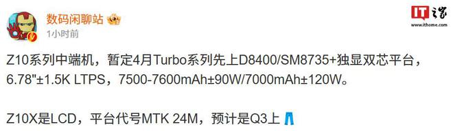 3 月 10 日消息,博主@数码闲聊站 今日发文透露,iQOO Z10 系列中端机暂定 4 月 Turbo 系列先上,新机高配版本搭载天玑 8400 / 骁龙 8s Elite + 独显双芯平台,配备 6.78 英寸左右 1.5K LTPS 屏,提供 7500-7600mAh 电池(估值容量,后同) +90W 快充和 7000mAh 左右电池 + 120W 快充两种方案。
