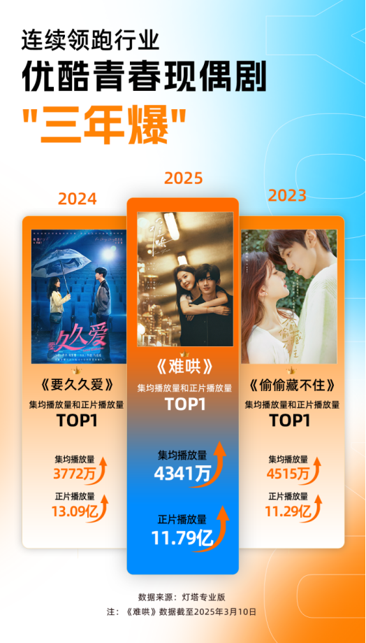 优酷都市爱情剧《难哄》自开播以来,凭借精制作、高话题频登各剧集榜首。据灯塔专业版数据,截至3月10日,该剧正片播放量破11亿,集均播放量超4300万,问鼎2025年灯塔现偶集均正片播放量冠军,成开年以来播出热度最高的青春题材作品。《难哄》也是继《偷偷藏不住》《要久久爱》后,优酷连续三年领跑青春现偶赛道,实现“三年爆”。