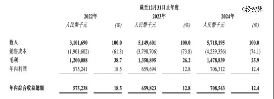 四千多家加盟店为周六福贡献了大部分营收。2022年至2024年,周六福营业收入分别为31.02亿元、51.5亿元、57.18亿元,同期利润分别为5.75亿元、6.6亿元、7.06亿元。其中,加盟模式收入分别占同期总收入的52.9%、55.4%和50.5%。