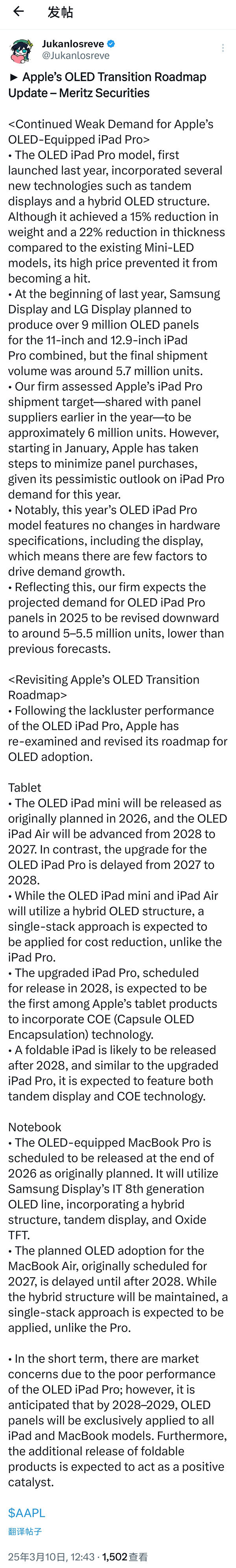 【CNMO科技消息】3月10日,有爆料者在X上透露,由于此前的OLED版iPad Pro销量表现疲软,苹果可能会调整其OLED产品路线图。