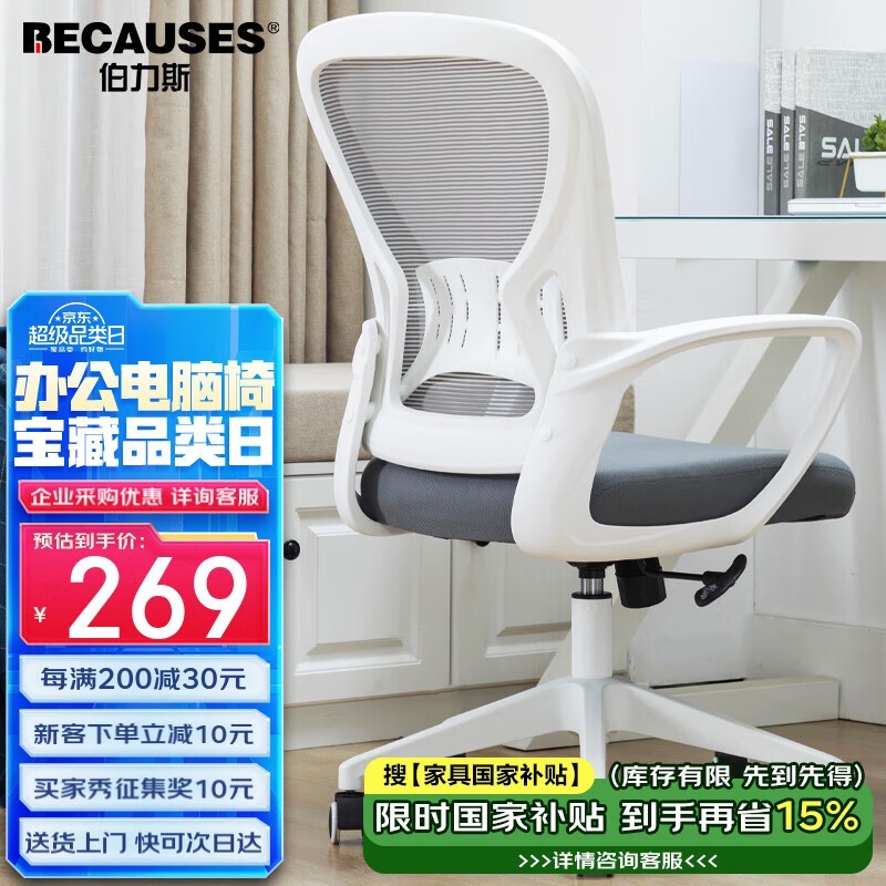伯力斯MD-0898W人体工学电脑椅白框灰网简约时尚舒适实用