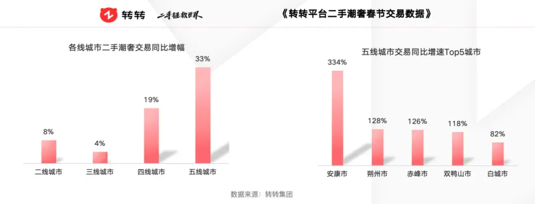 今年春节,非一线城市二奢交易更是迎来了爆发式的增长。据转转公布的春节数据(2025年1月5日-2月5日)显示,平台四、五线城市二手潮奢交易量分别同比增长达19%、33%。该平台公布的2024年全国各区域二手奢侈品交易数据也显示,2024年三四线城市的订单量保持了双位数增长,五线城市同比2023年增长8个点。