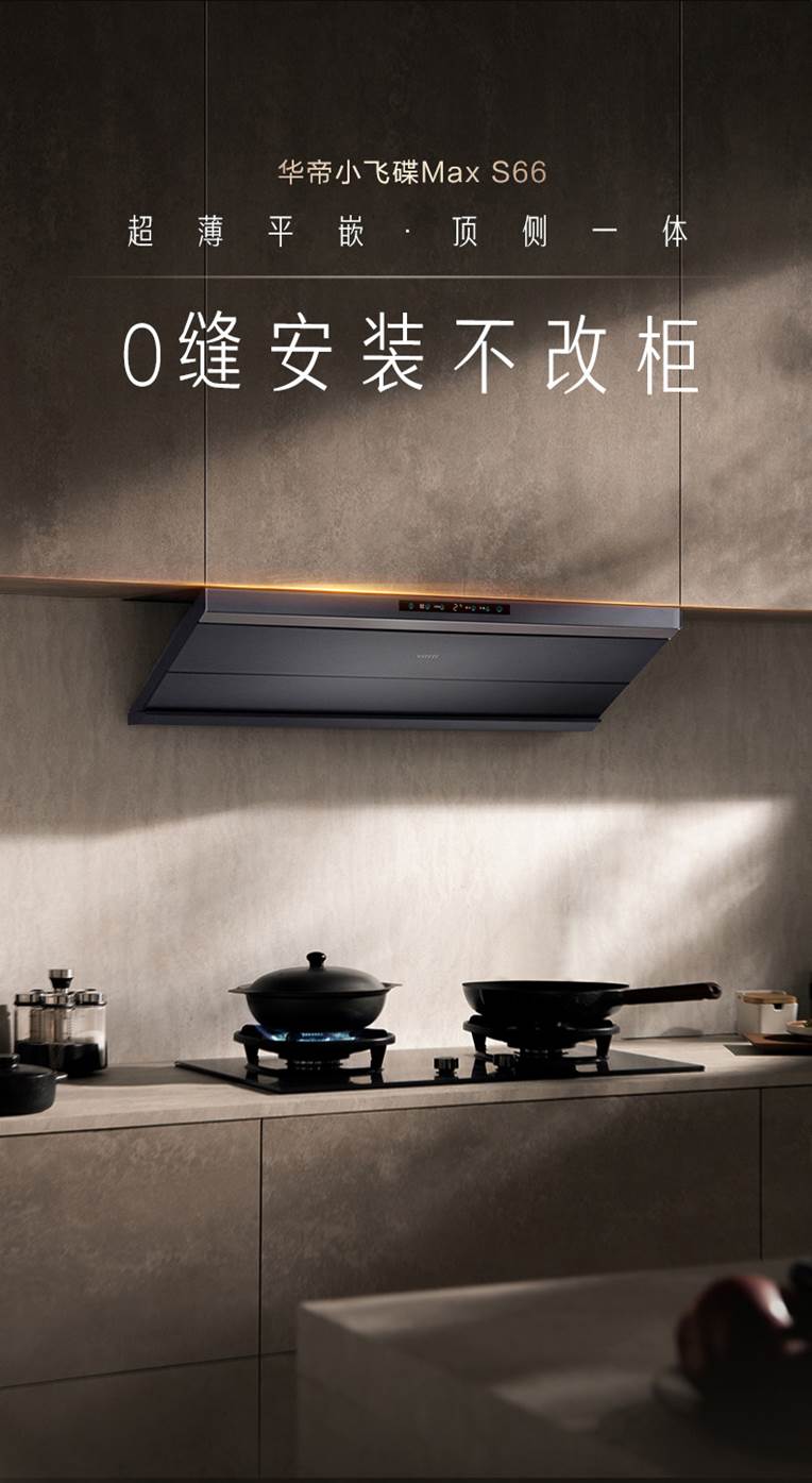 其中华帝小飞碟Max烟机实现了0缝安装不改柜的超薄平嵌设计,顶侧一体化设计,释放更多的空间,采用AG真肤感玻璃,手感温润细腻,更易清洁,诠释着真正的美学价值,具有28m³/min大吸力,确保油烟一网打尽,同时搭配了1200Pa变频强排烟,有效防止油烟倒灌,搭载了自研的“冲浪自动洗”功能,洗涤覆盖率达99%以上,满足了消费者对“净洁厨房”的期待。