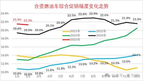 崔东树表示,合资燃油车的促销幅度增长尤为明显,2025年2月促销幅度达到21.3%,较同期增加2.3个百分点。
